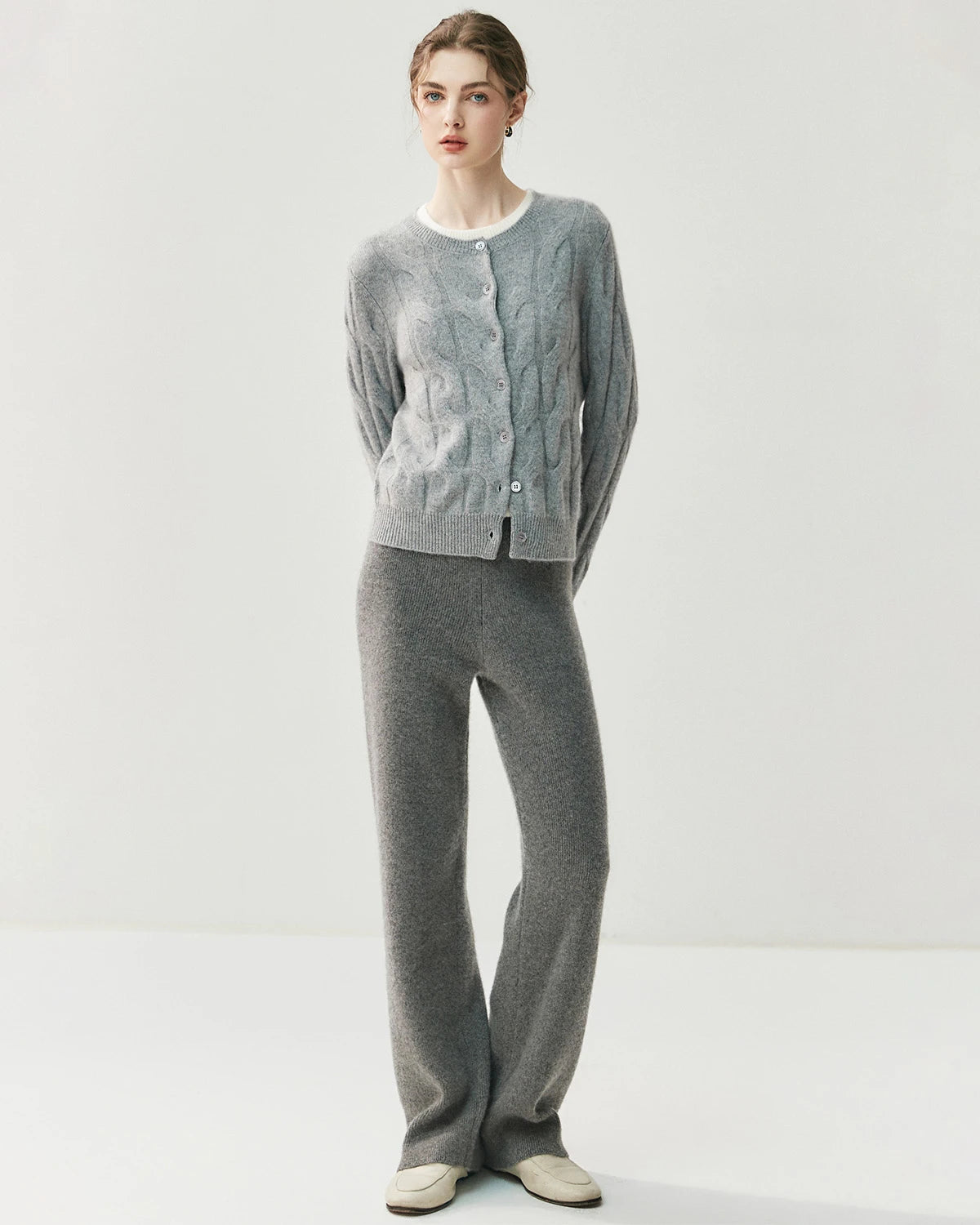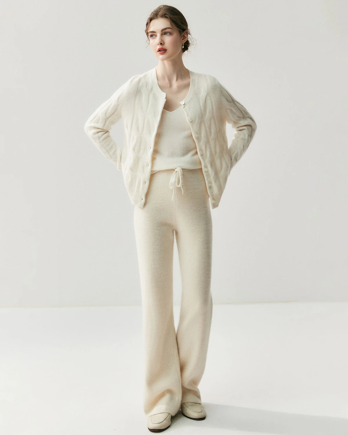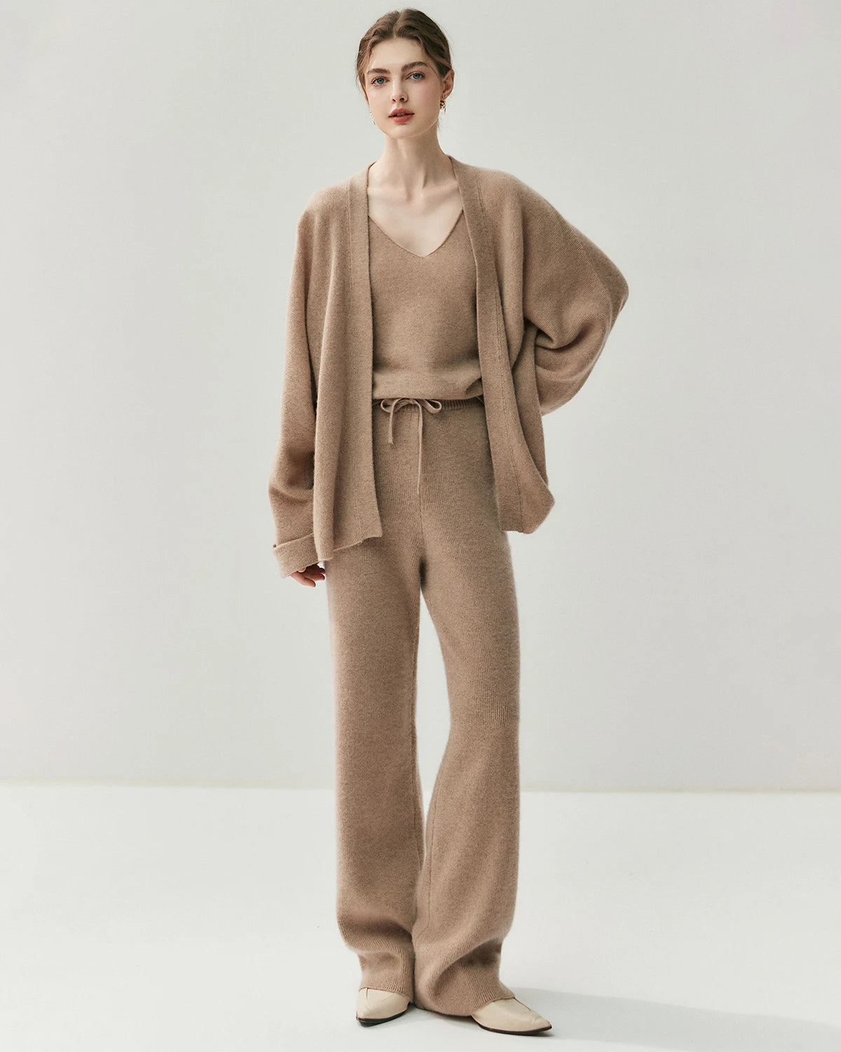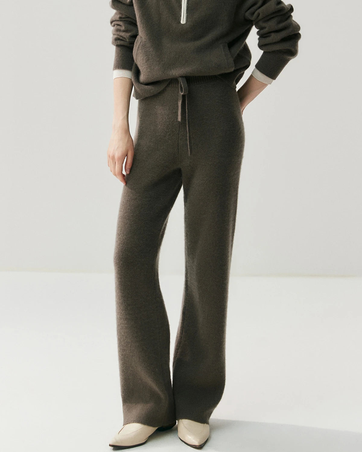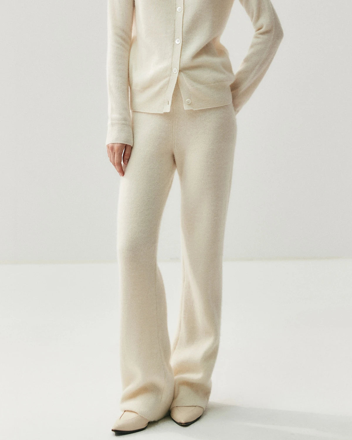 Spun from a premium blend of 65% Australian wool and 35% cashmere, these women’s cashmere pants deliver the perfect combination of softness, warmth, and stretch. The breathable knit fabric provides a smooth hand feel and gentle elasticity, making these cashmere wool trousers a timeless essential for elevated comfort.