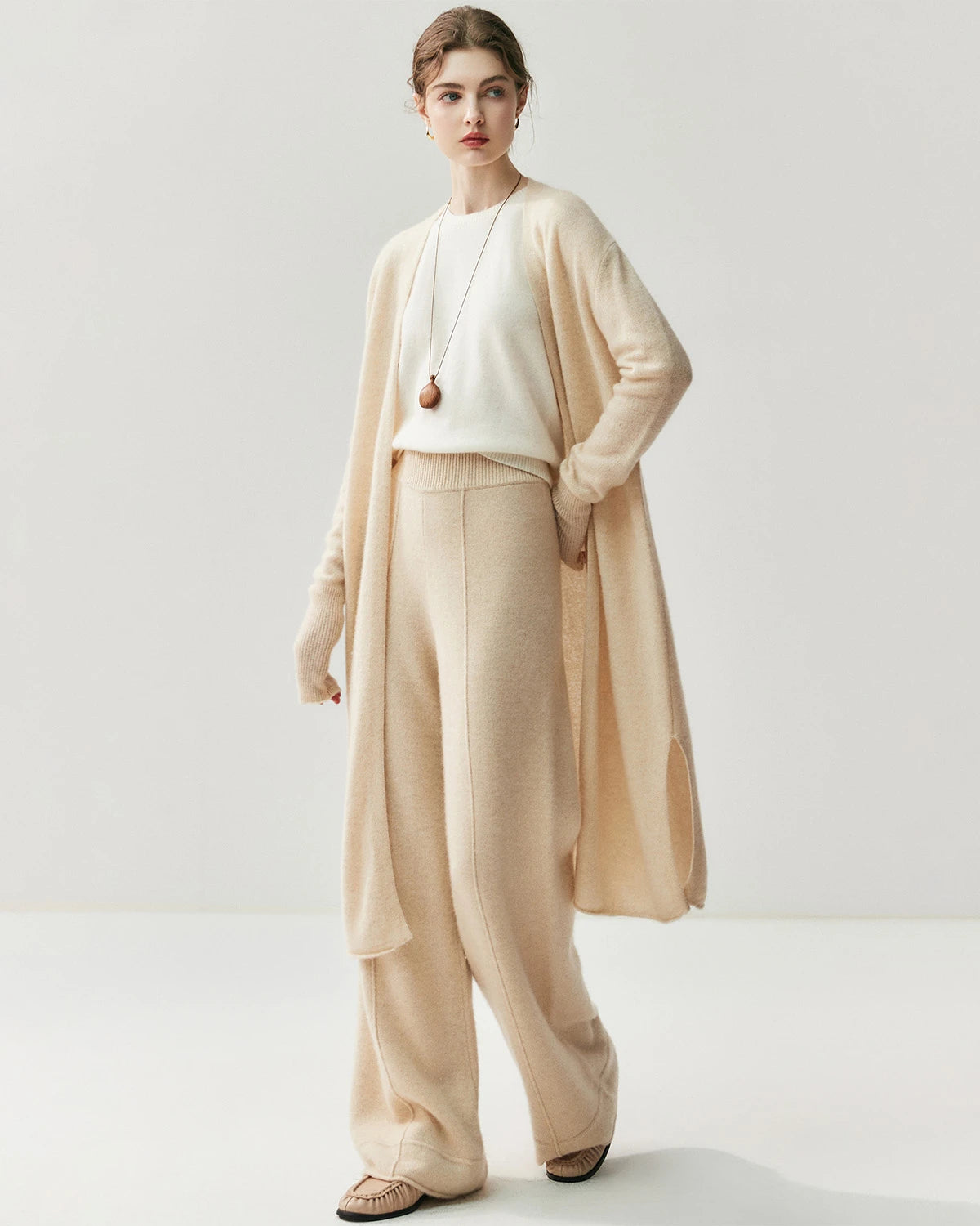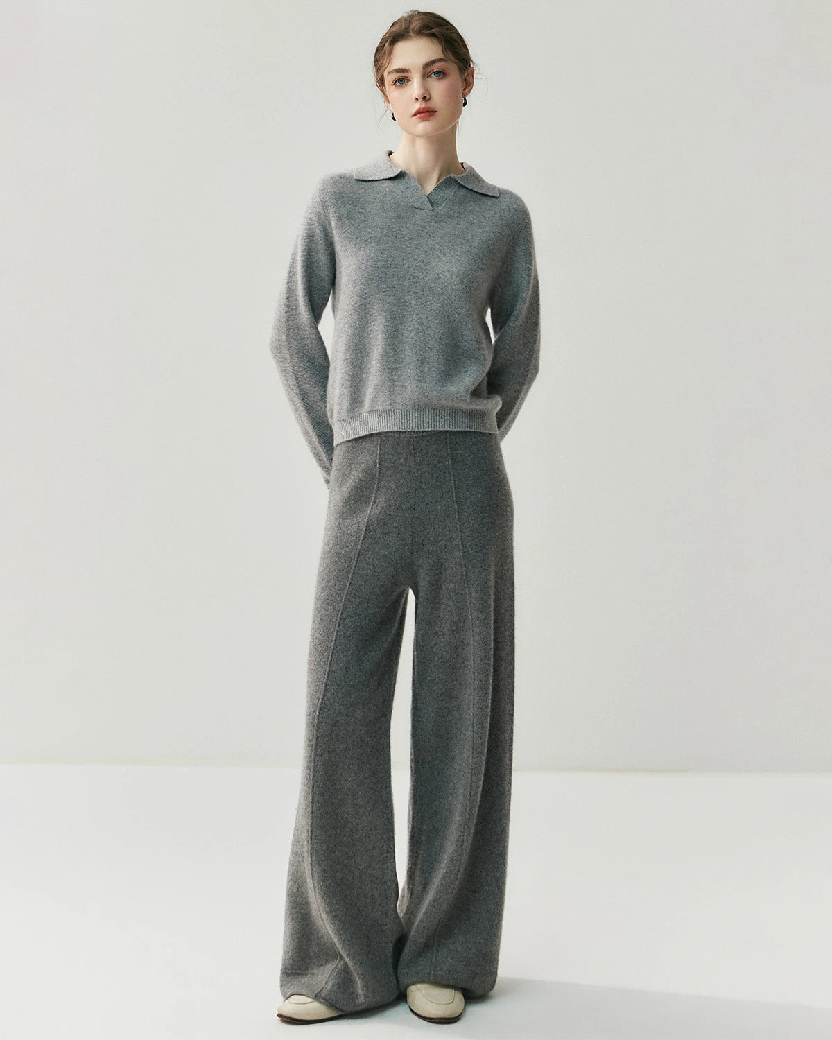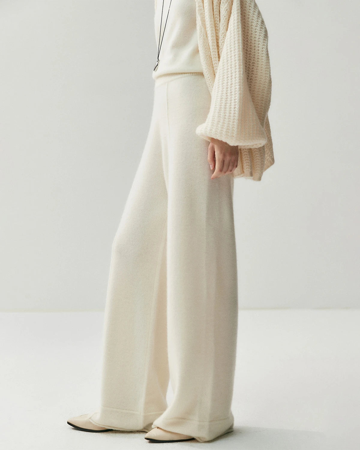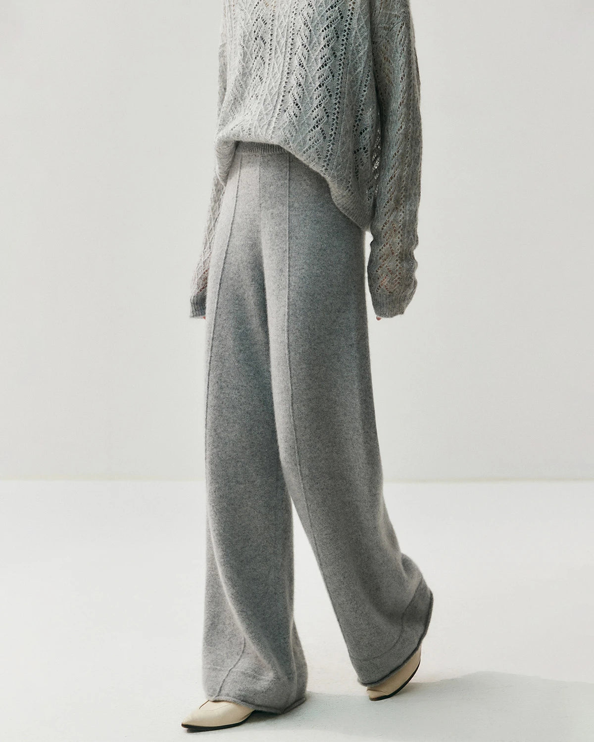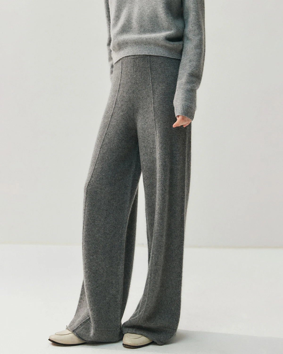 These women’s cashmere trousers feature a refined front seam detail that elongates the legs and creates a tailored silhouette. The wide leg knit design adds an elegant drape and movement, while the flexible waistband ensures a comfortable, flattering fit. Subtle structure meets modern minimalism, making these cashmere pants suitable for both casual and refined styling.