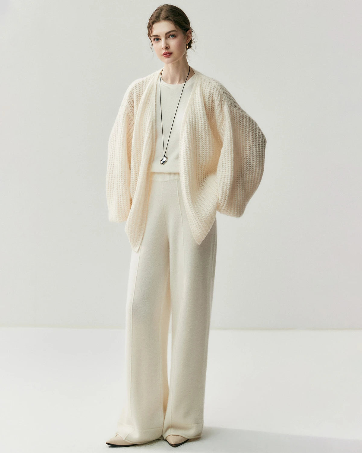 Perfect for lounging, travel, or effortless everyday dressing, these wide leg cashmere knit pants combine cozy sophistication with a contemporary edge. Pair them with a matching cashmere sweater for a coordinated look, or with a blouse for elevated chic. Essential for women who appreciate comfort and timeless style.