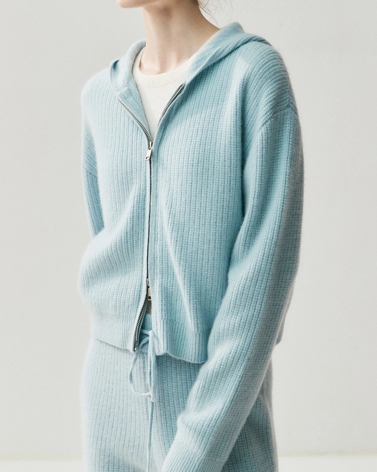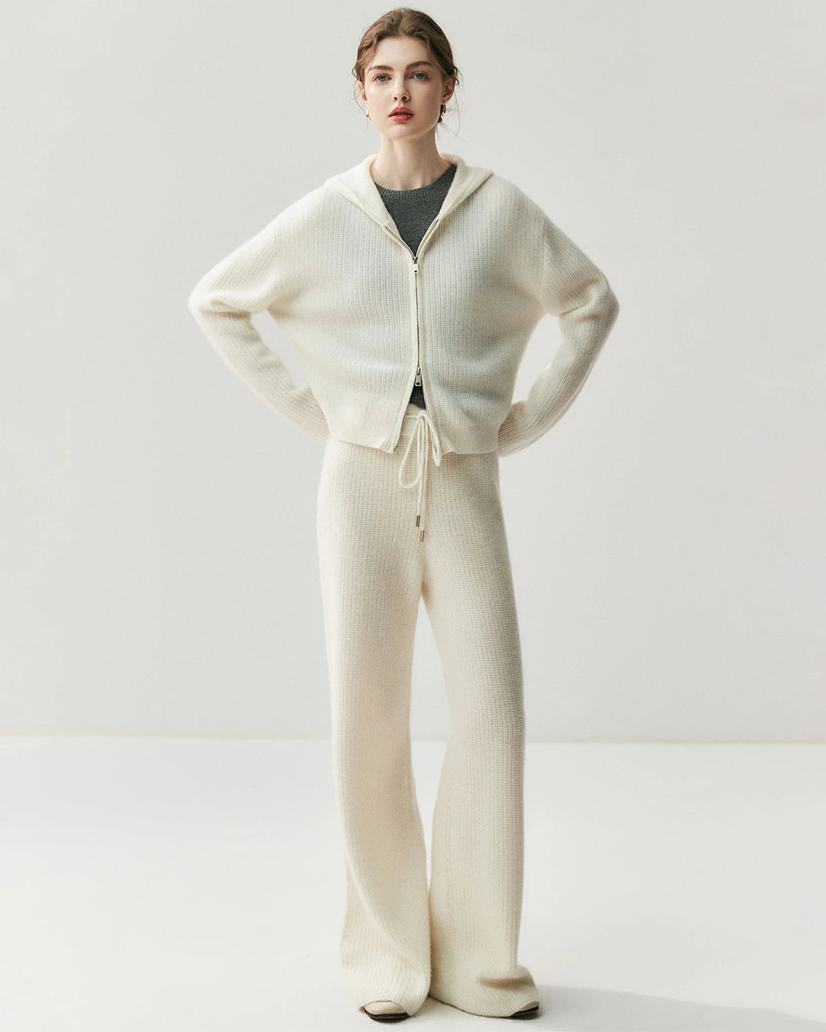 Stay effortlessly chic and cozy in the DaisySilk Cashmere Wool Hoodie Set for Women. This two-piece set features a short zip-up hoodie cardigan with a waffle-knit texture and matching straight-leg pants, both made from a luxurious blend of wool and cashmere. The waffle knit adds subtle texture and warmth, while the breathable softness of the cashmere blend ensures all-day comfort. Perfect for travel, lounging, or casual outings, this women’s cashmere hoodie set balances relaxed elegance and timeless style.