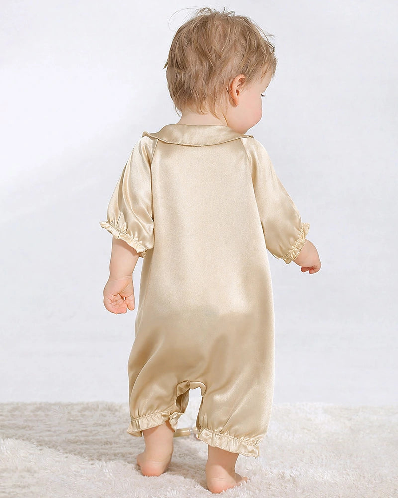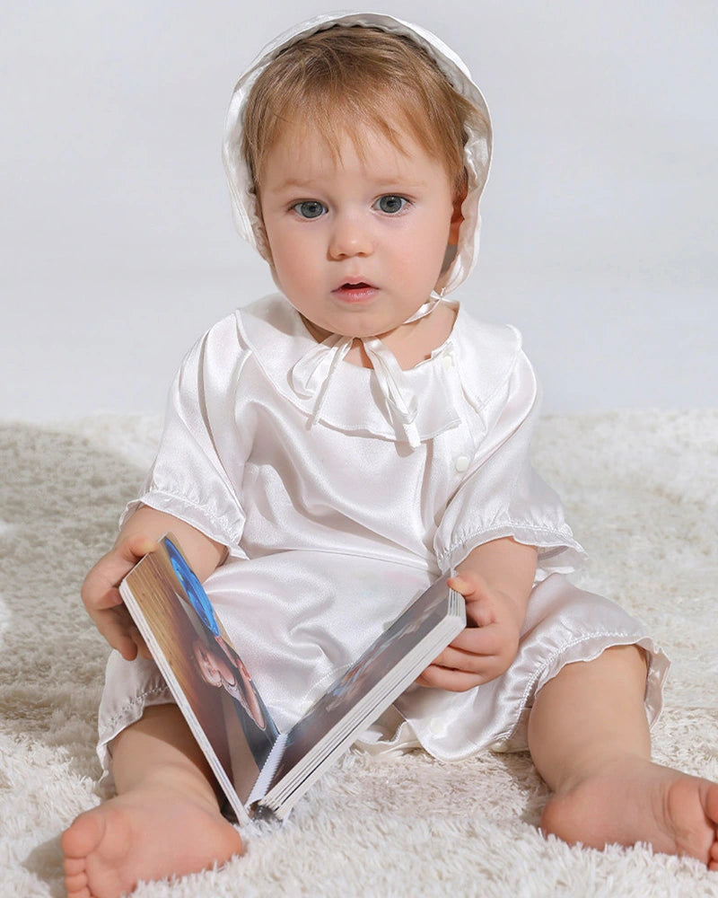 Introducing our Doll Collar Puff Sleeve Baby Silk Onesies, where timeless elegance meets modern comfort. Made from 100% pure silk, these onesies are designed to caress your baby’s delicate skin with the utmost softness. The natural breathability of silk ensures your little one stays cool and comfortable throughout the day.