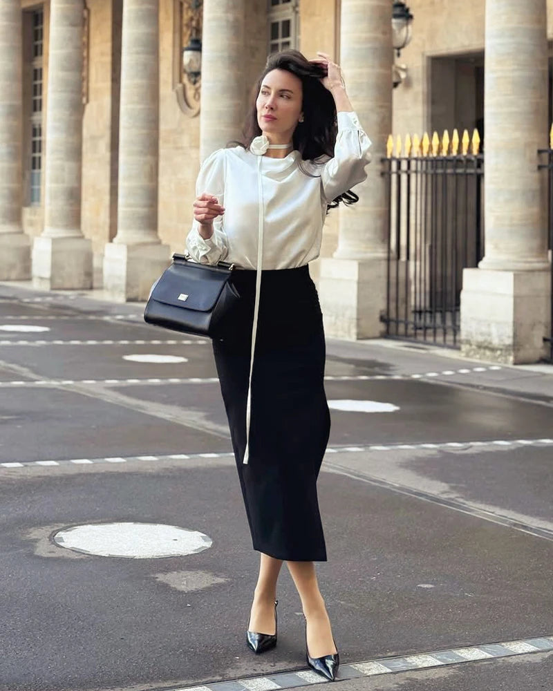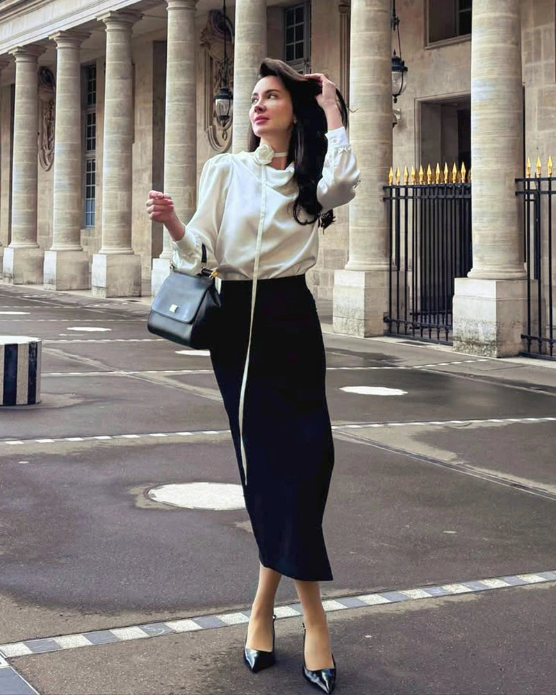 Featuring an elegant draped collar and romantic puff sleeves, this long sleeve silk blouse elevates your wardrobe with timeless sophistication. The delicate rosette necklace detail adds a feminine touch, making it ideal for ladies silk blouses in white, black, pink, or green for versatile styling.