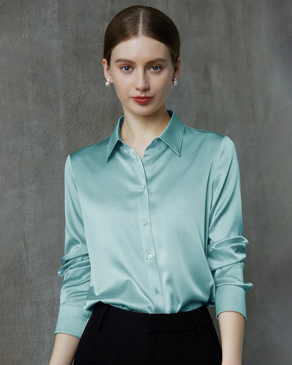 Made from high-grade 100% mulberry silk, this long sleeve silk blouse features a heavier 22 momme weight for enhanced durability, opacity, and a refined sheen. The fabric feels soft against the skin, resists wrinkling better, and maintains its shape wear after wear.