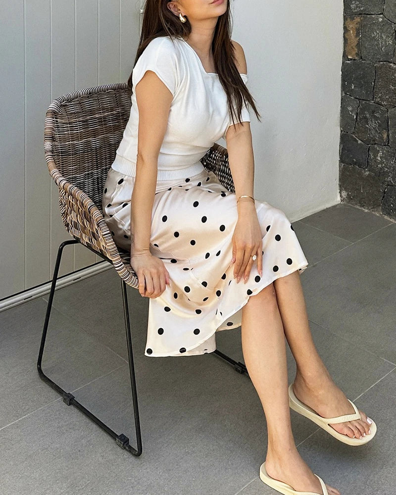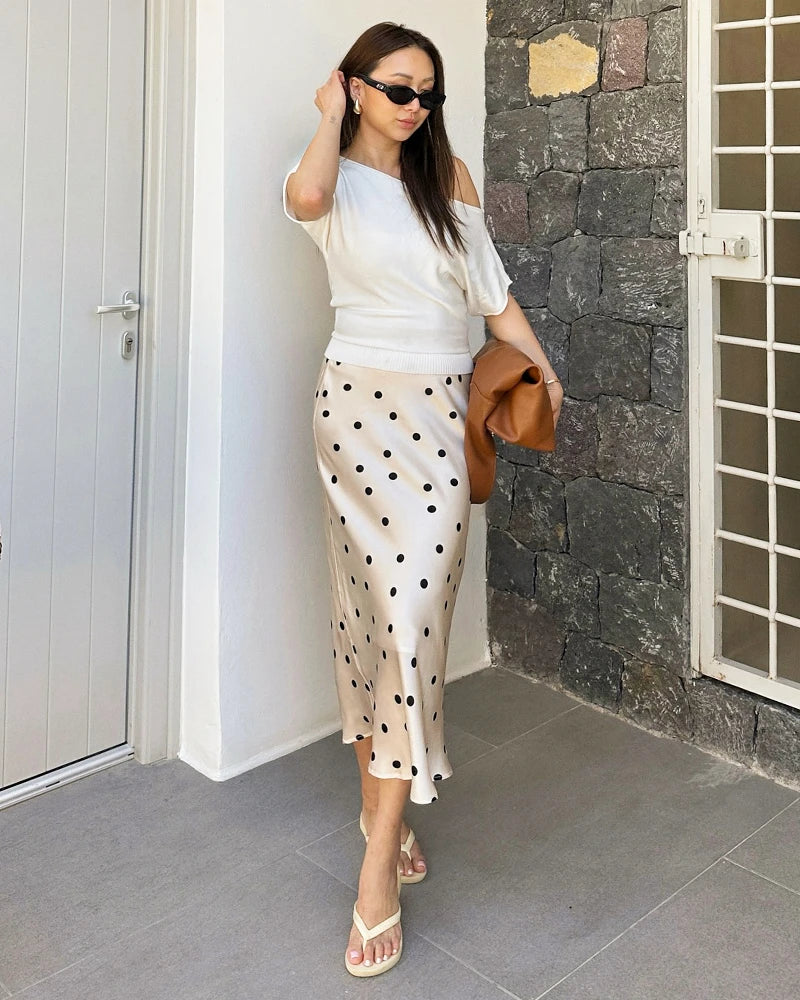 Elevate your style with the Polka Dot Silk Midi Skirt, made from premium 19 momme silk stretch double joe. Its lightweight, silky texture ensures a graceful drape, while the classic polka dot pattern adds a playful yet sophisticated touch. Designed with a midi length and an A-line cut, this skirt flatters every figure and transitions seamlessly from day to night. Perfect for brunches, work, or evening events, it’s a versatile piece that exudes timeless charm.