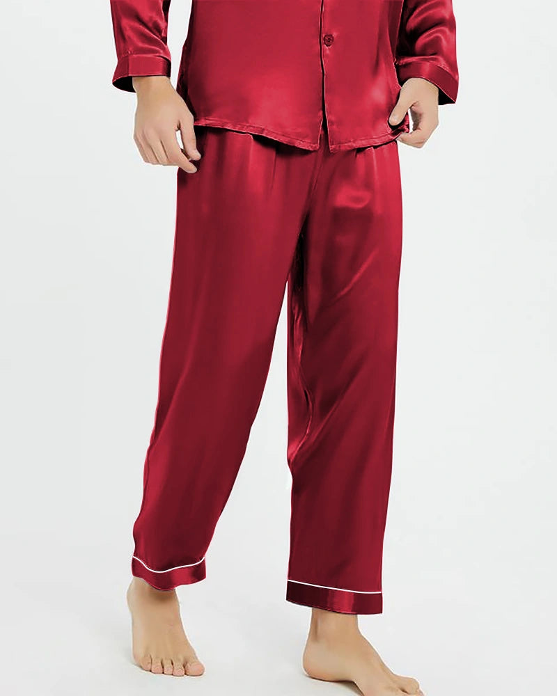 These men’s silk pajama pants are crafted from premium mulberry silk, offering a smooth, breathable feel that makes them ideal for sleep and everyday lounging. The long, relaxed silhouette delivers effortless comfort, while the contrast piping at the leg hem adds a subtle, refined touch to the classic design.