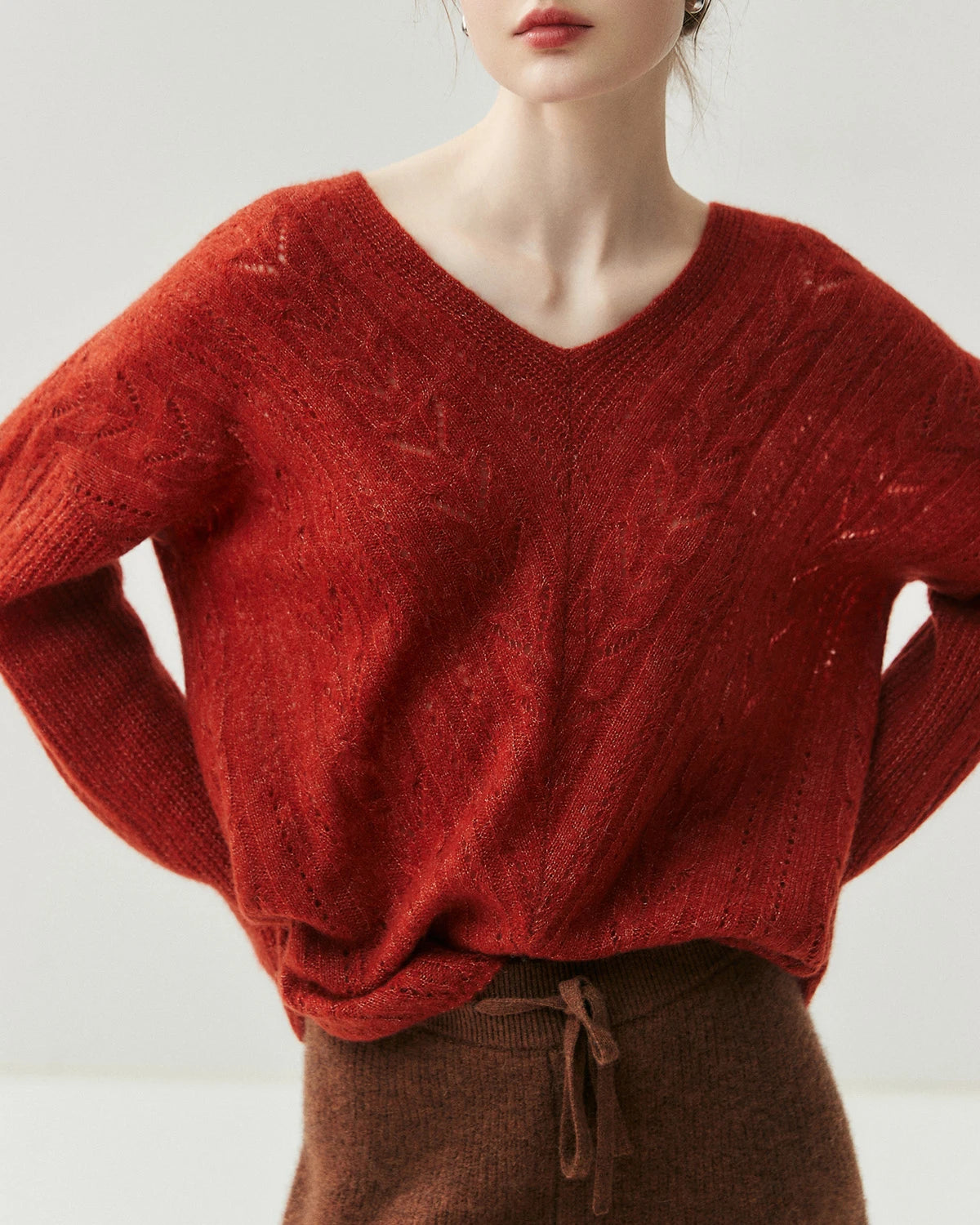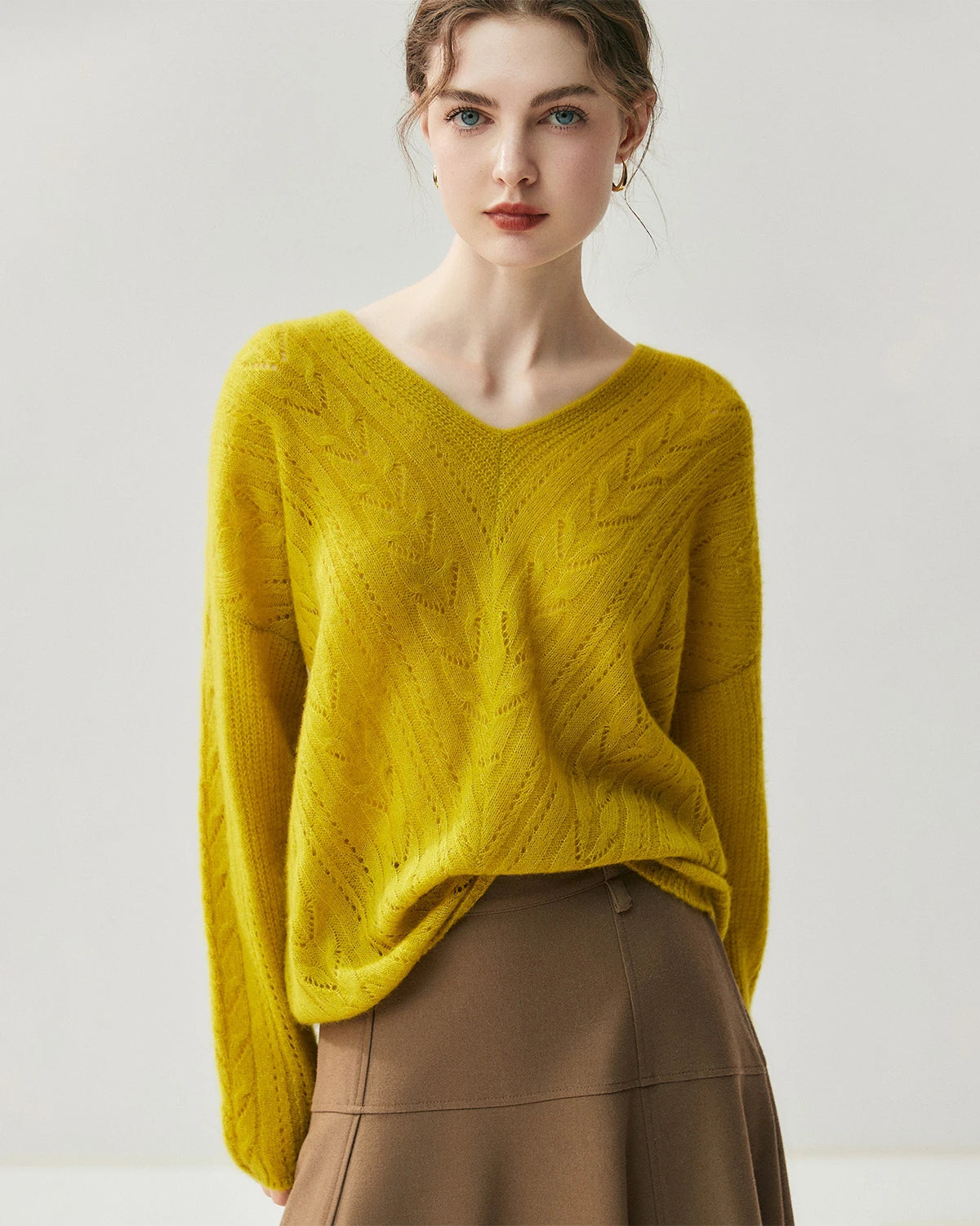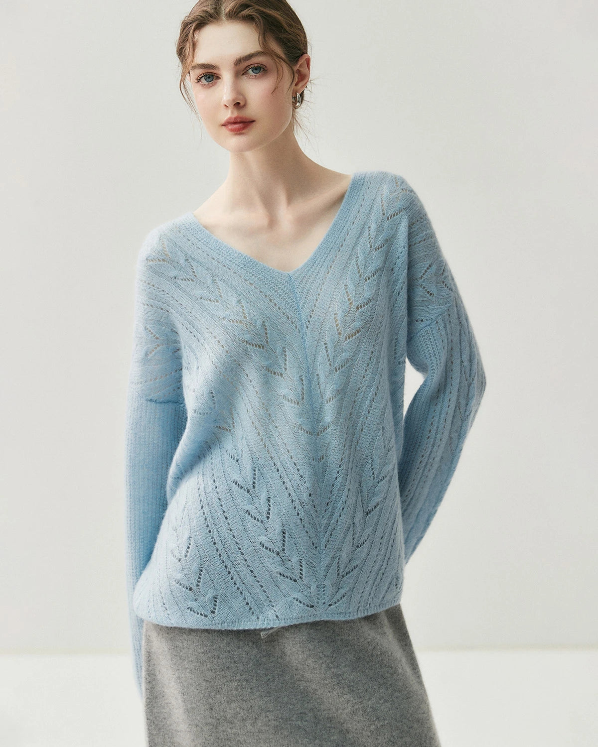 This lightweight V-neck pullover features delicate cable knit openwork with a refined, relaxed silhouette. Designed as a classic cashmere pullover sweater, it highlights timeless style and modern versatility. The fine knit structure makes it perfect as a lightweight cashmere sweater for women, suitable for women's v neck cashmere sweater and cardigan sweater cashmere looks.