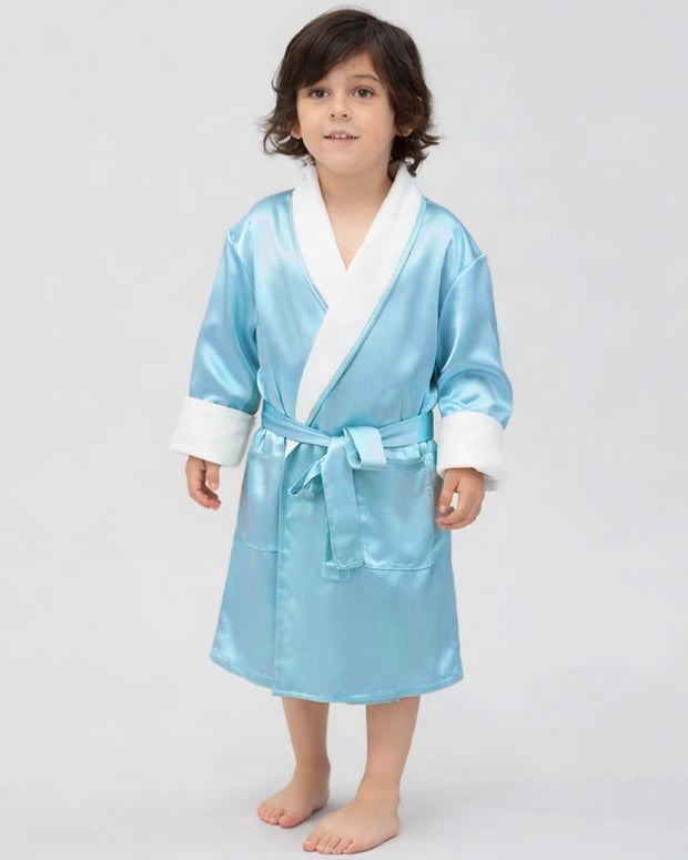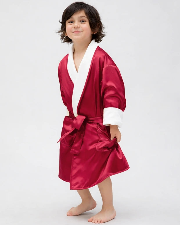 Designed with a classic notched lapel collar, this long sleeve kids silk robe features a timeless silhouette suitable for both boys and girls. The reversible construction allows children to choose between a cool silk feel or a warm fleece touch, depending on comfort needs. Two functional front pockets add everyday practicality.